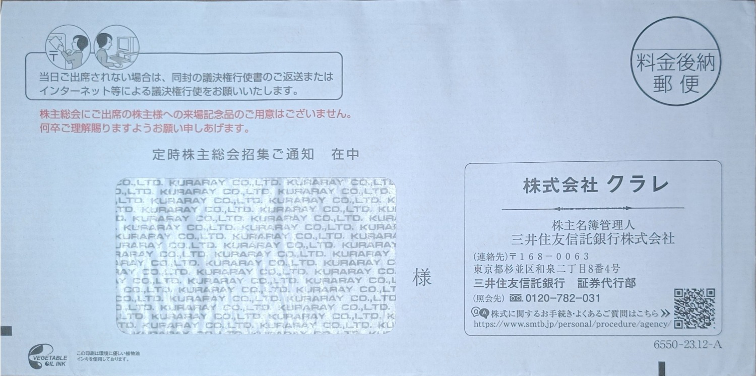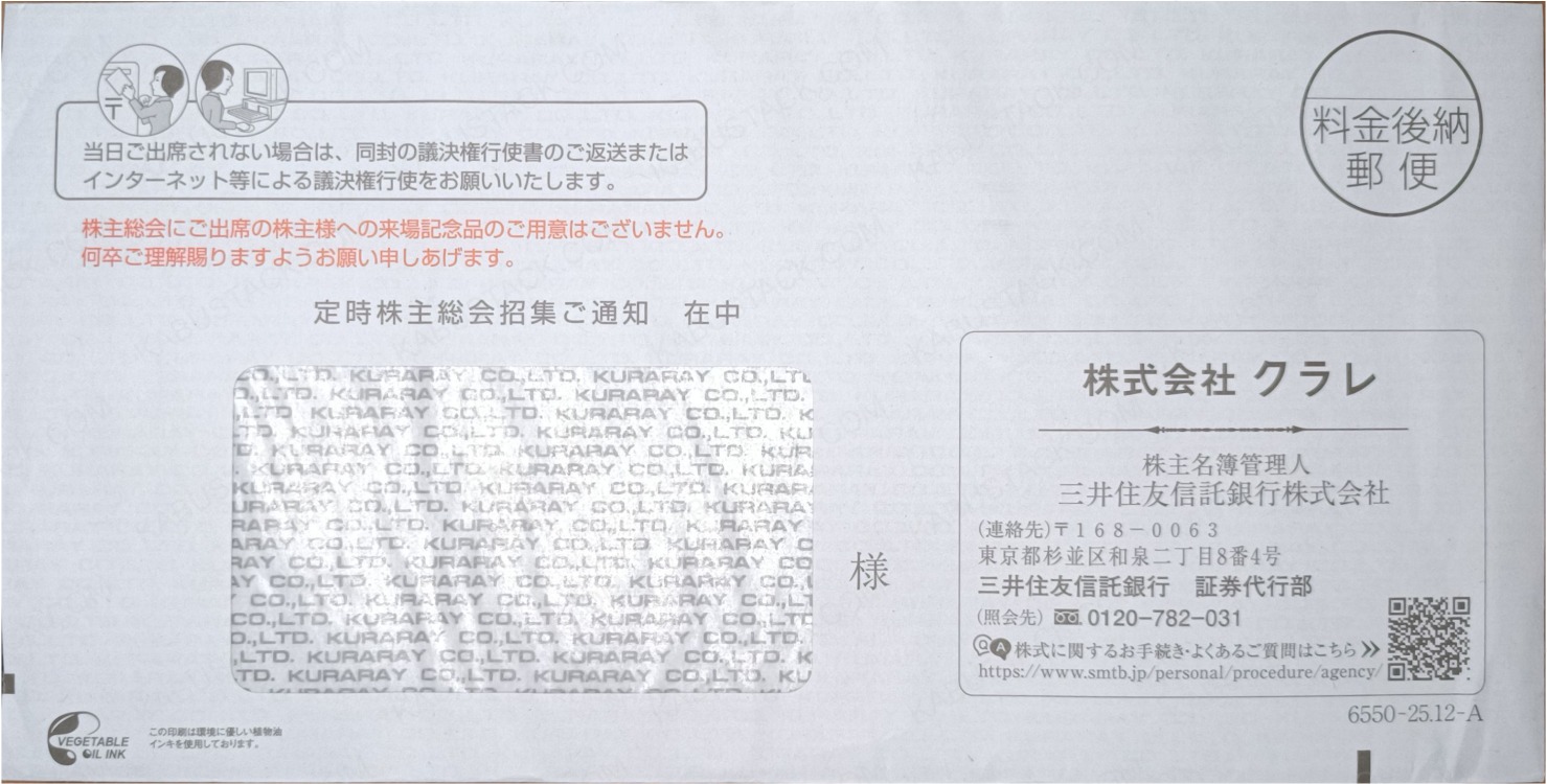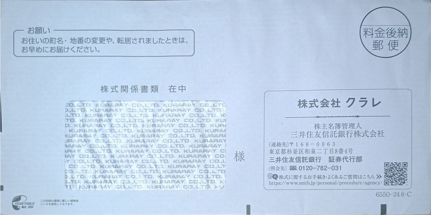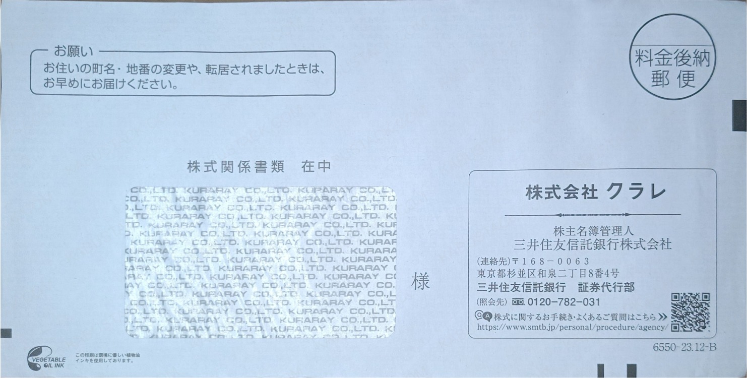 中身を取り出すと、宛名欄に透けて見える封筒内側の会社ロゴ。封筒の反対面にも会社のロゴがあるパターン。