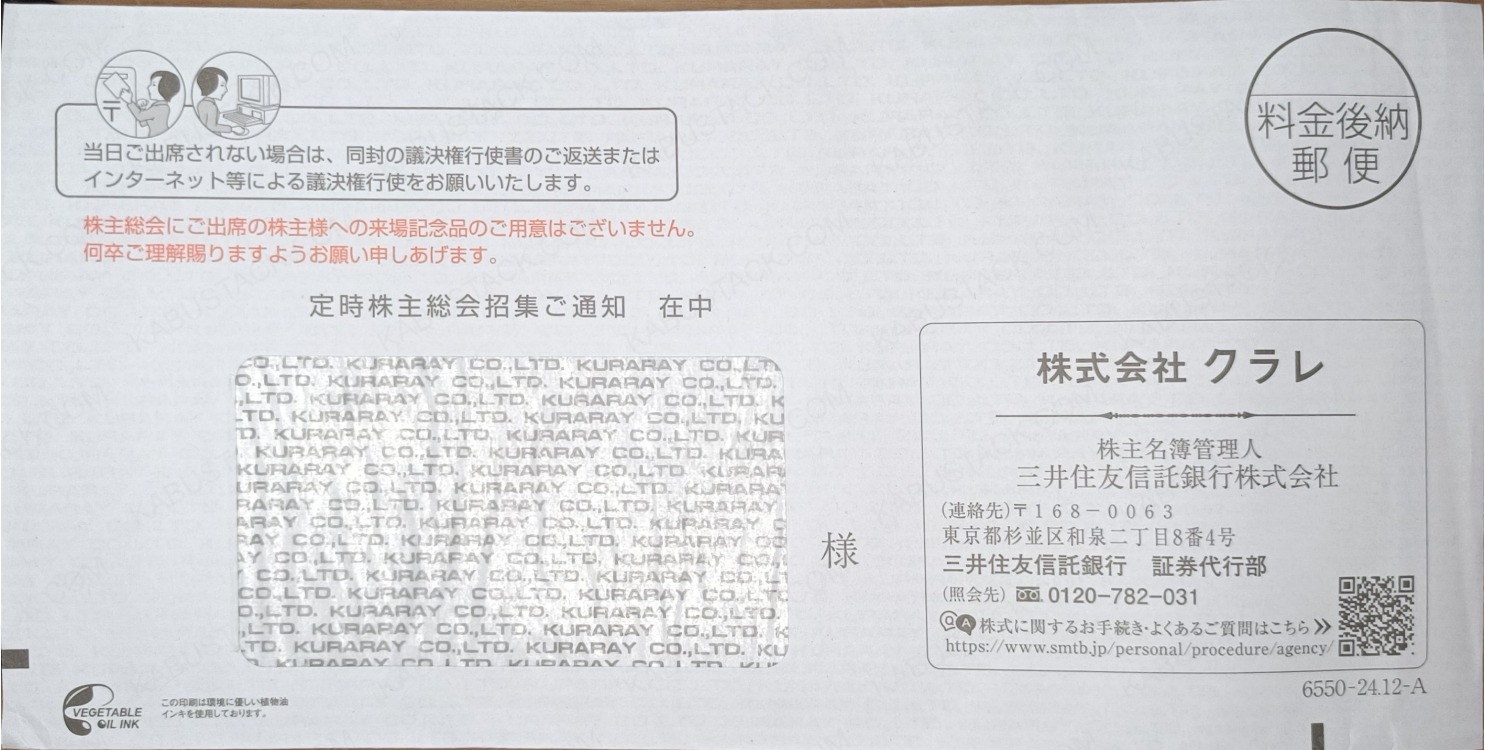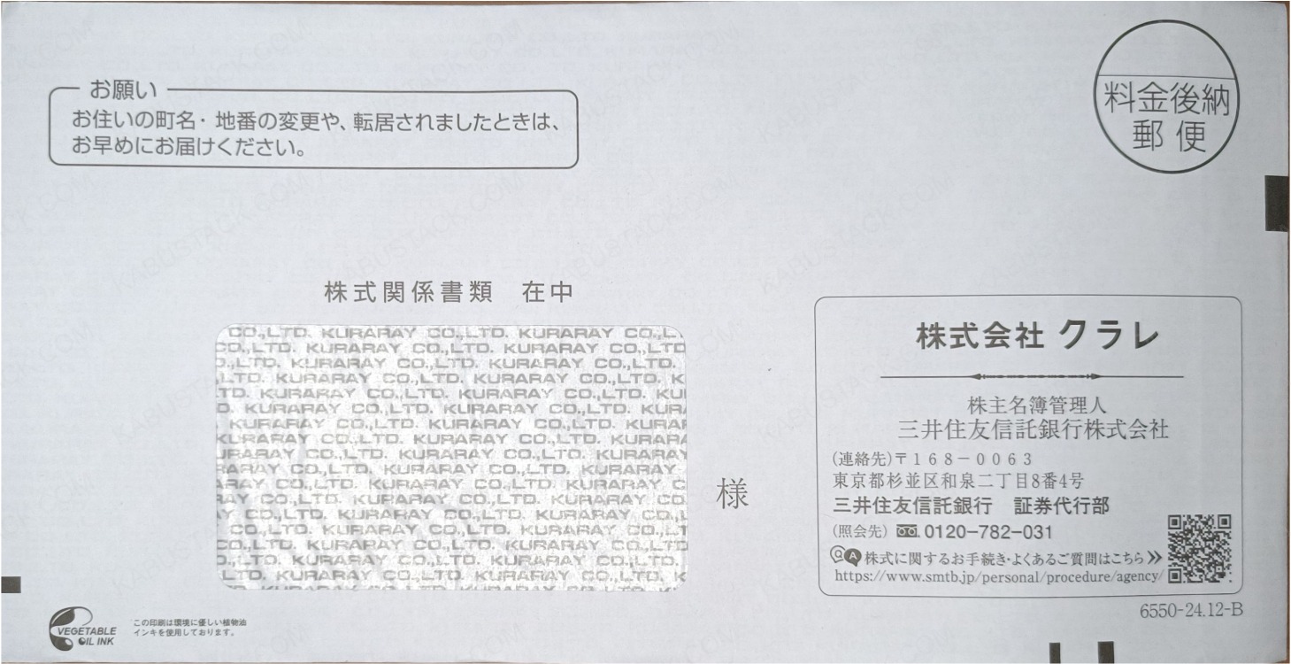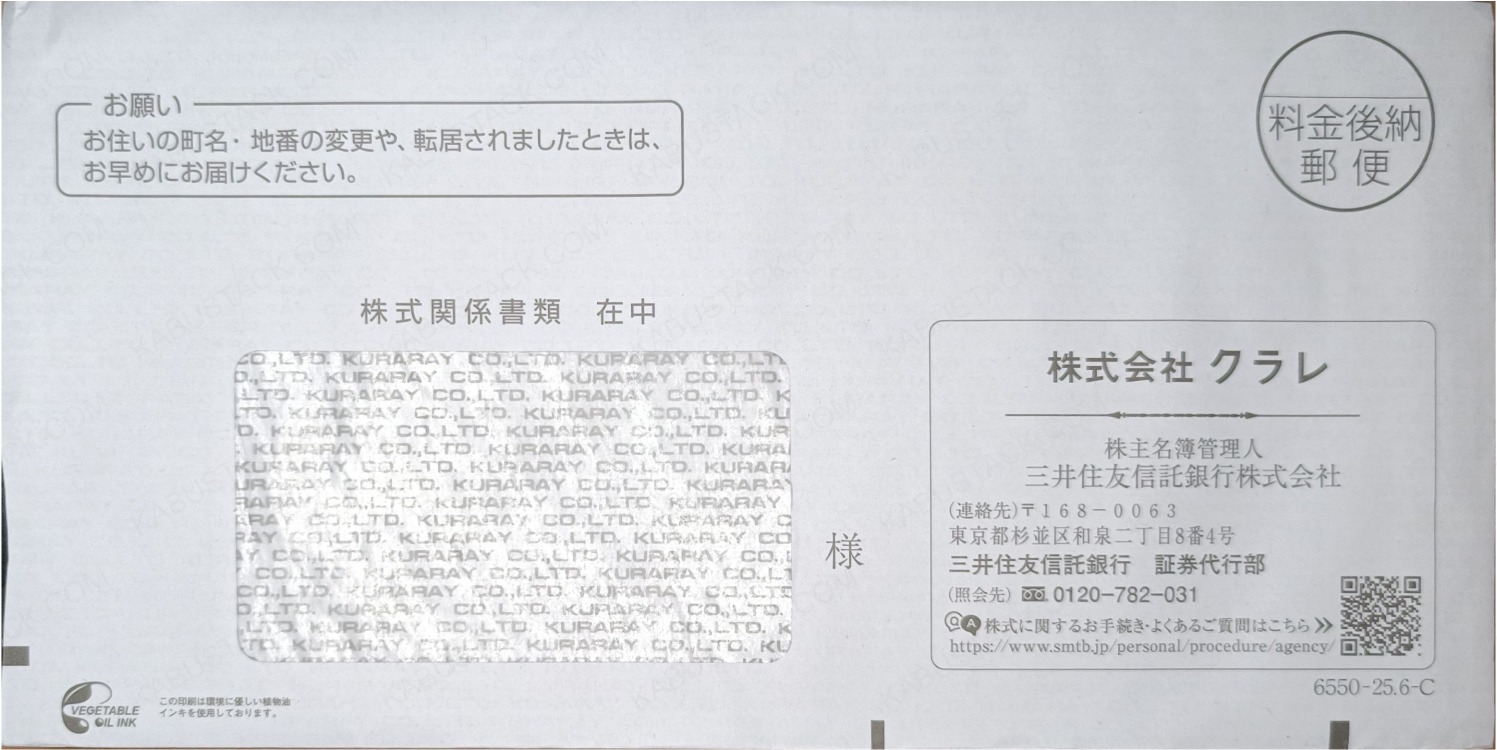 中身を取り出すと、宛名欄に透けて見える封筒内側の会社ロゴ。封筒の反対面にも会社のロゴがあるパターン。