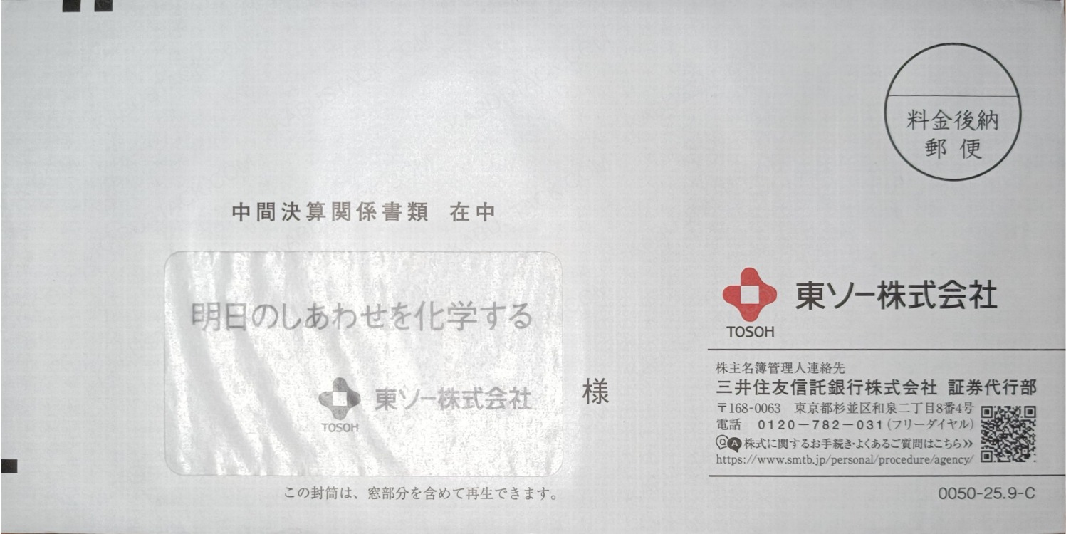 中身を取り出すと、宛名欄に透けて見える封筒内側の会社ロゴとメッセージ。右下には会社のロゴ。赤黒の2色刷り。