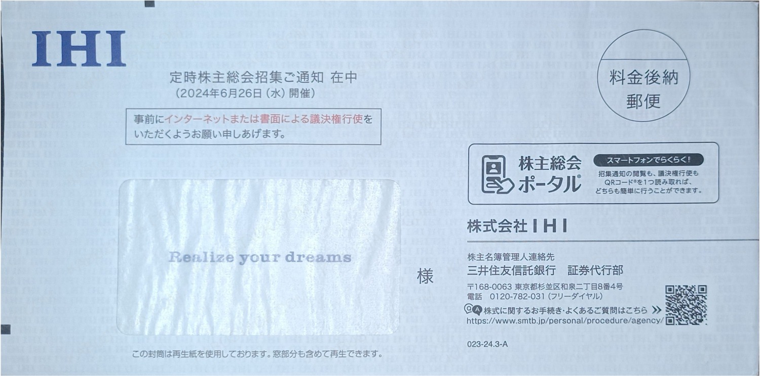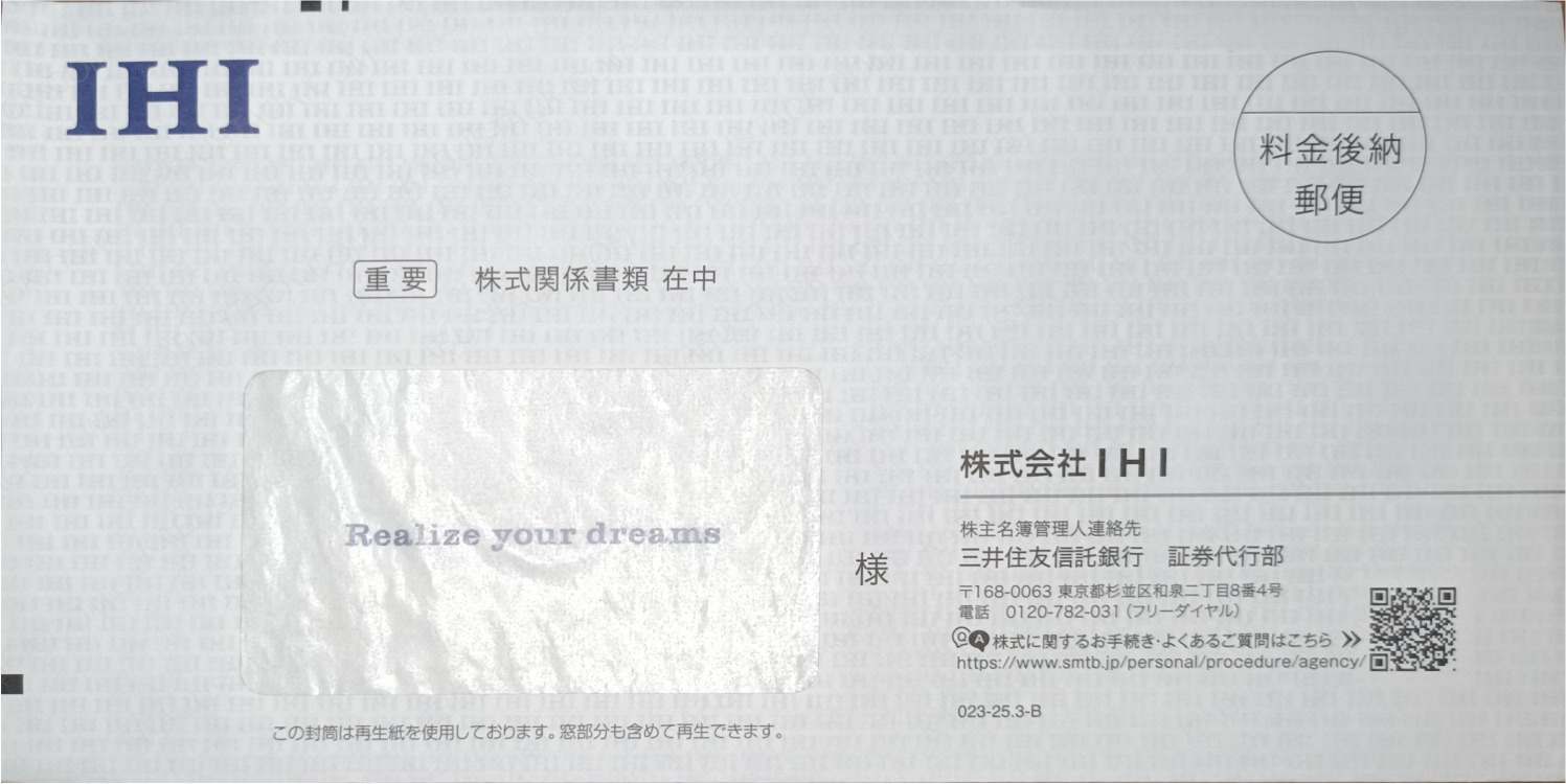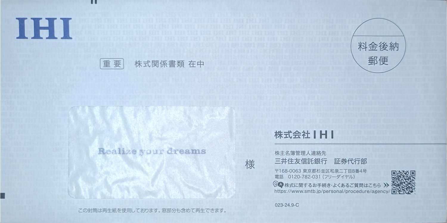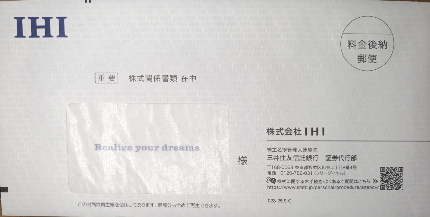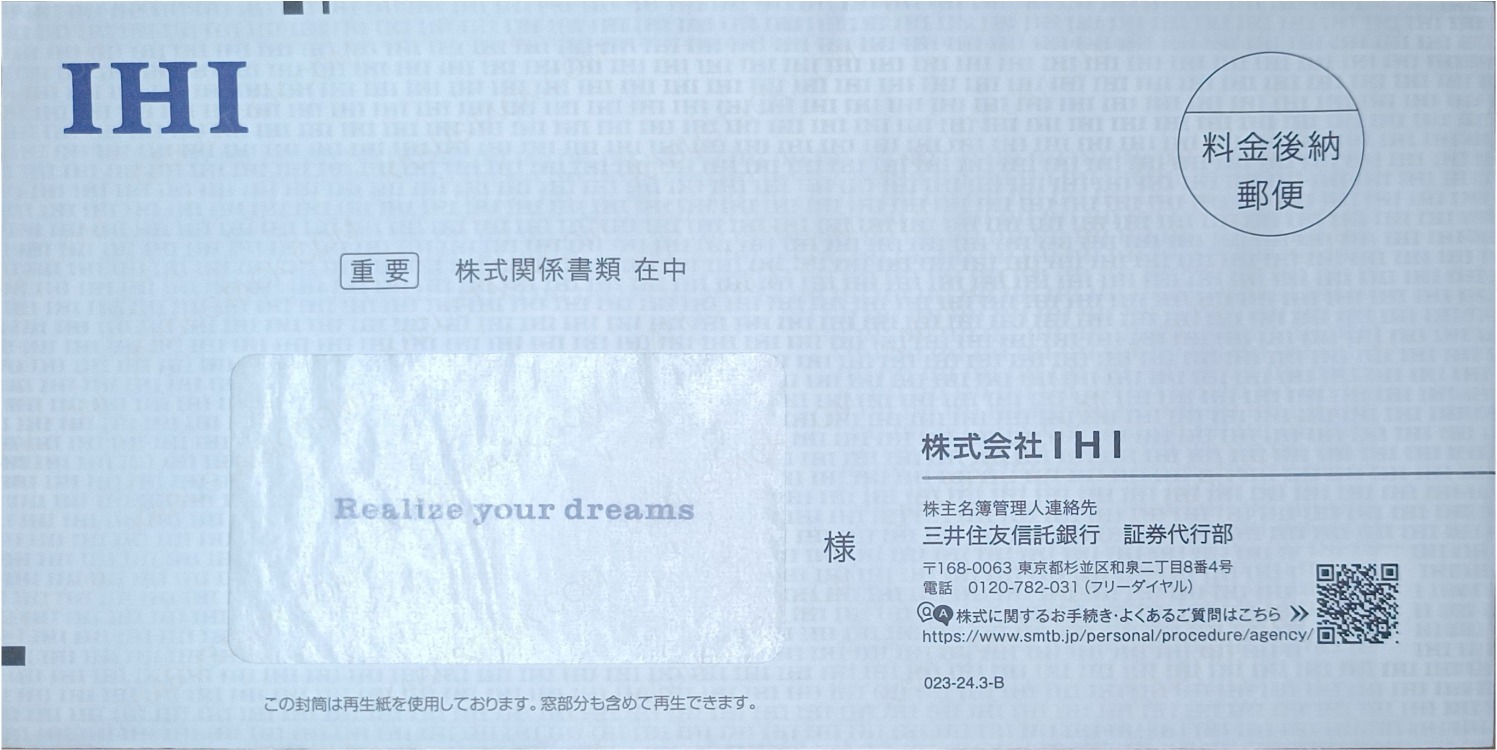 左上に会社のロゴ。宛名欄に透けて見えるメッセージ。封筒の裏印刷に無限IHI。