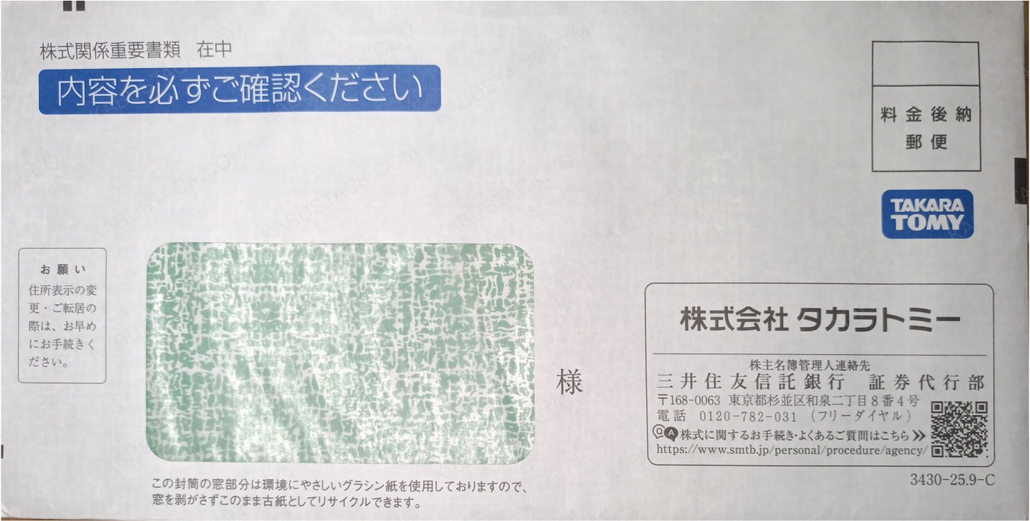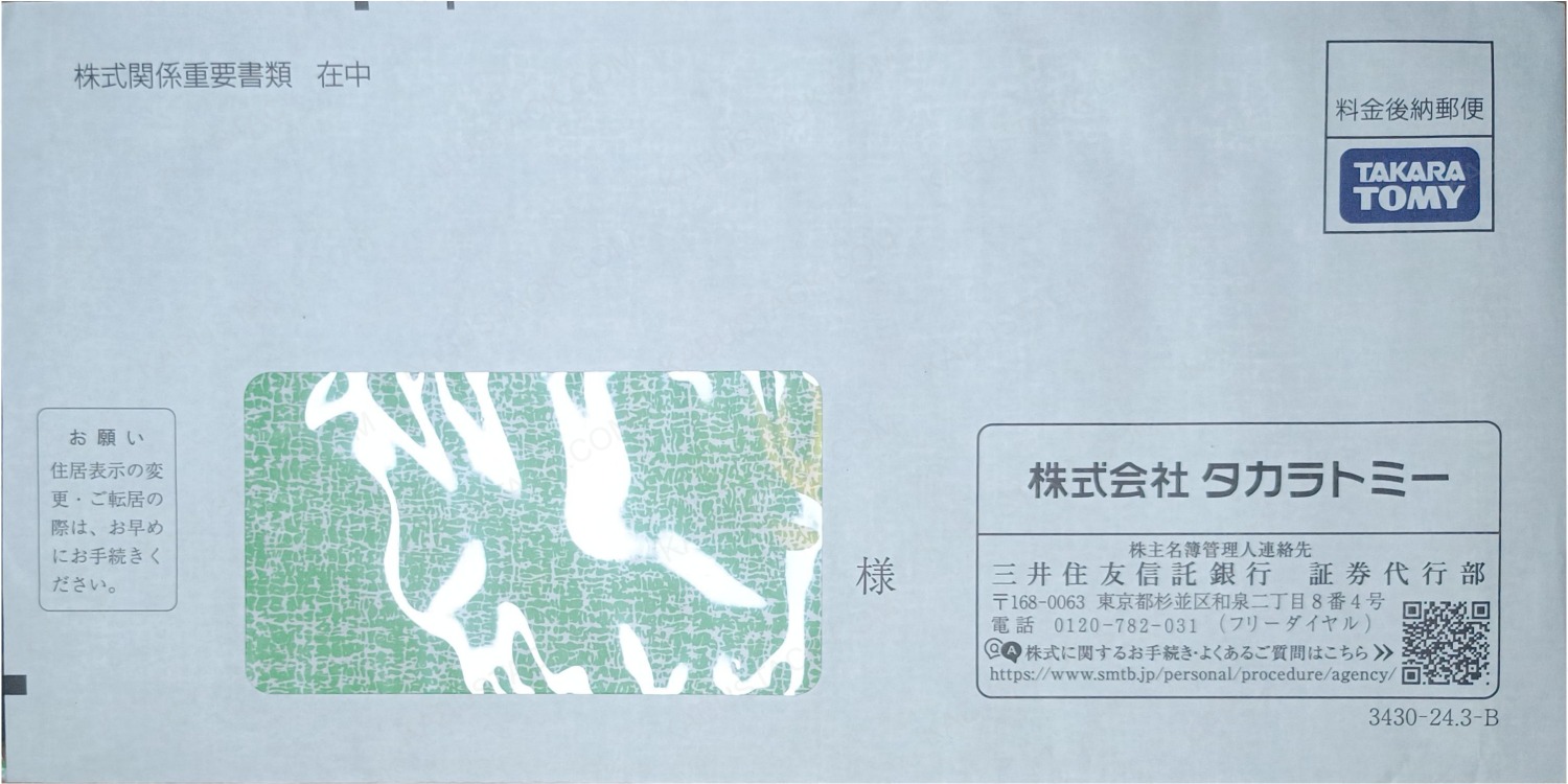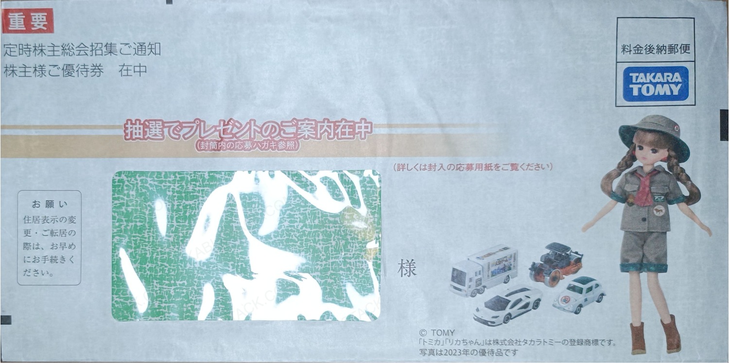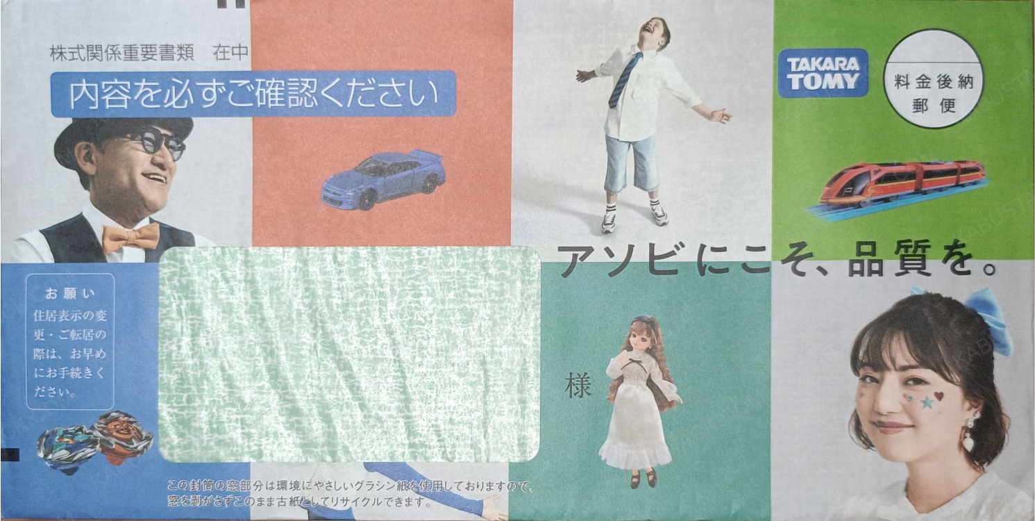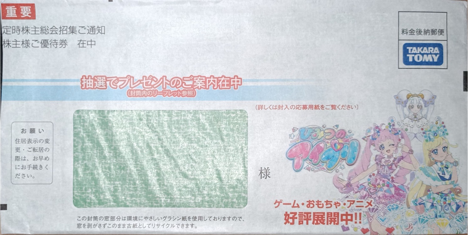 優待の封筒が今回もかわいい。かなりオリジナルな感じになっていて、今年からグラシン紙になった。