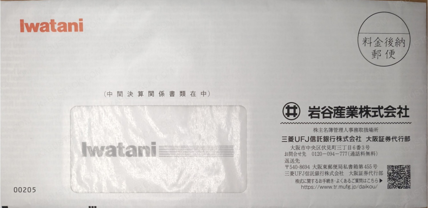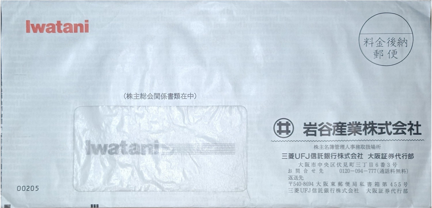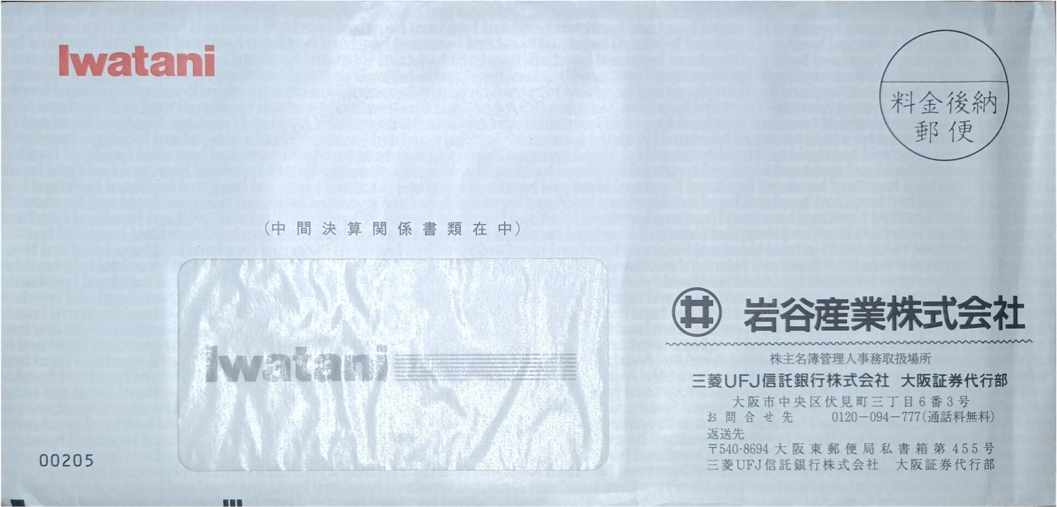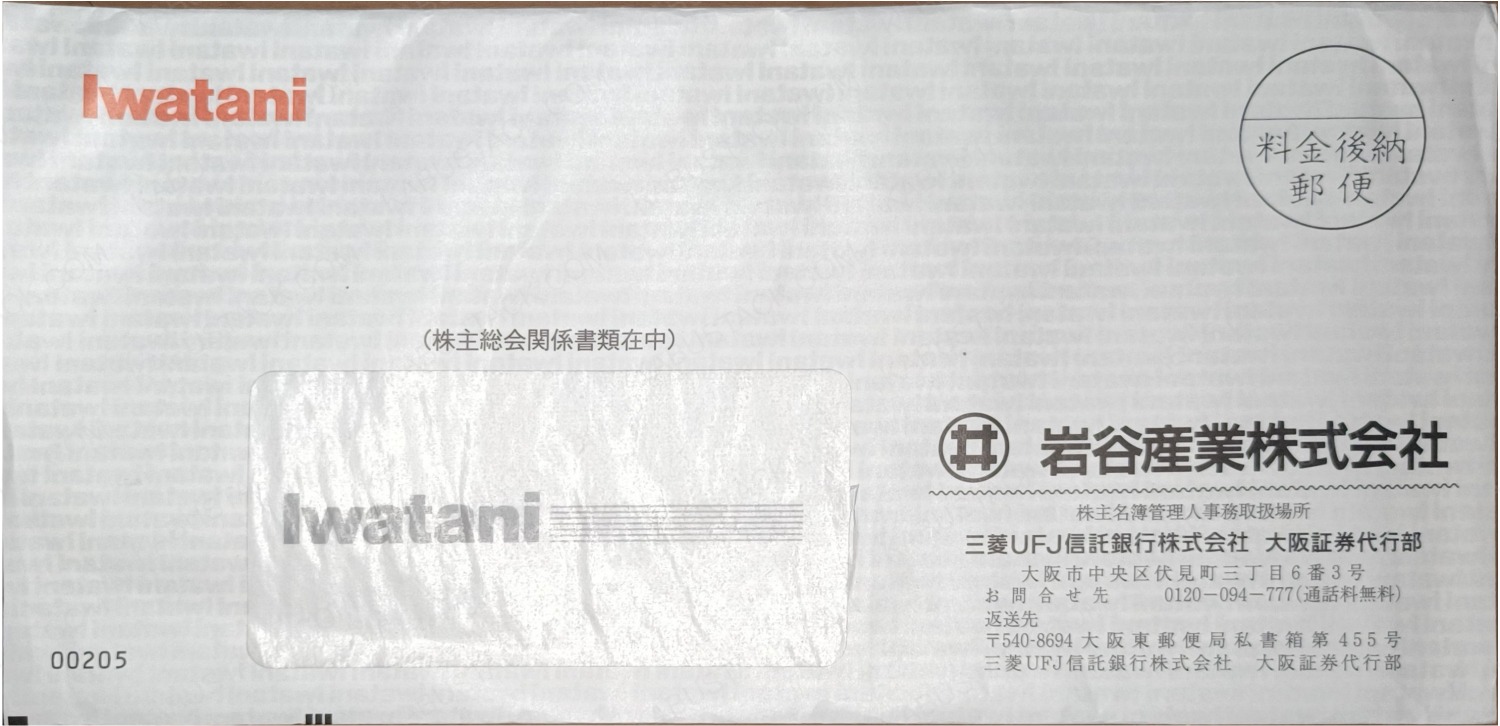 左上、右下、宛名欄の3か所にロゴが入っているパターン。赤黒の2色刷り。封筒内側にIwataniの無限印刷。